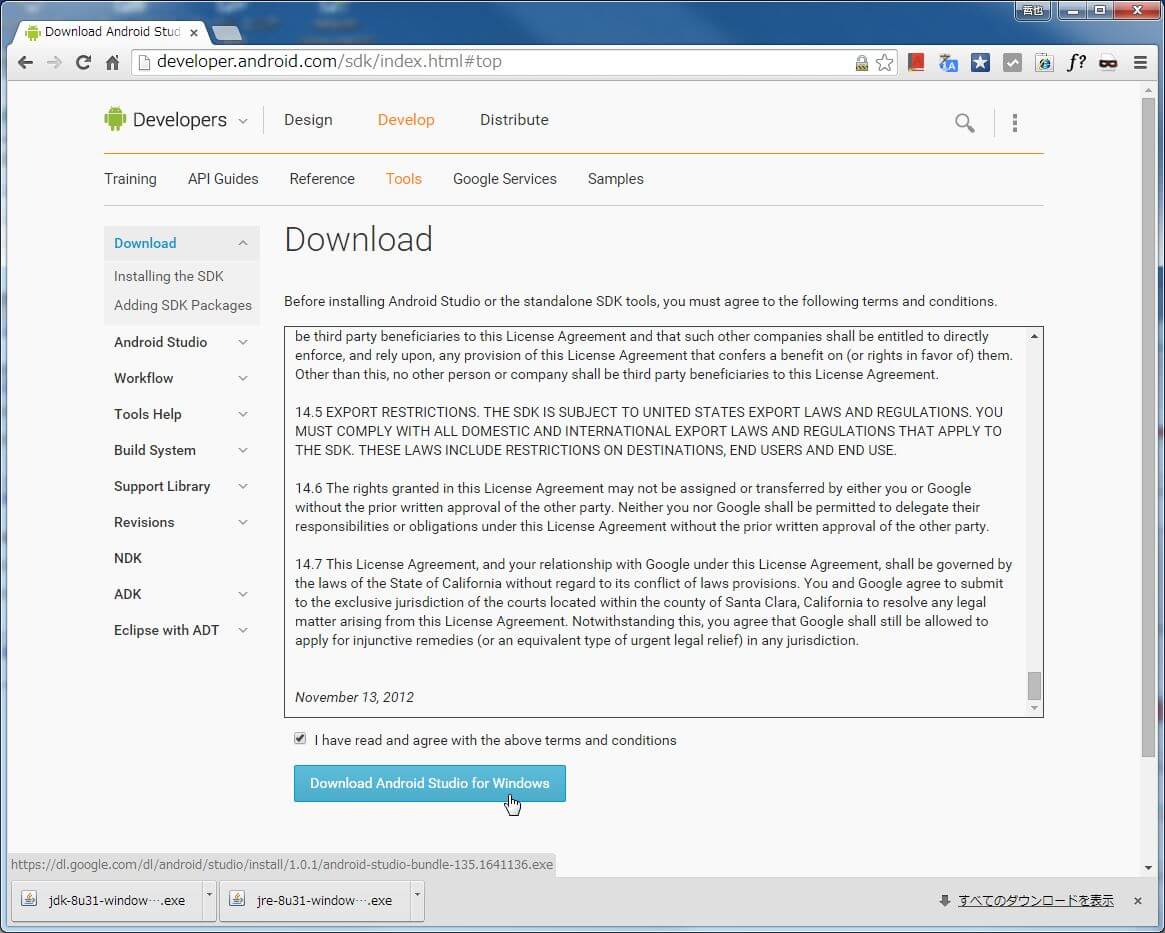 チェックをオンにすると[Download Android Studio for Windows]がクリックできるようになるので[Download Android Studio for Windows]ボタンをクリックする。