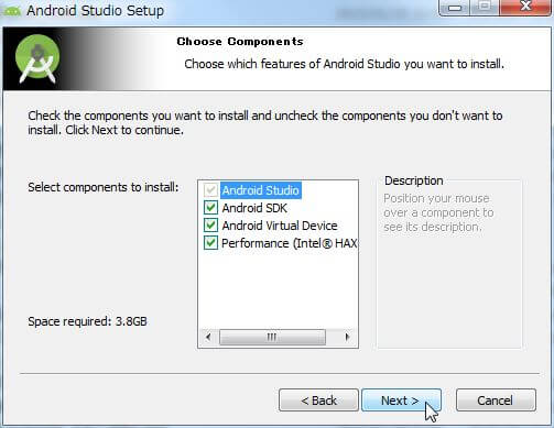 [Welcome to the Android Studio Setup]画面が表示されるので[Next>]をクリックする。