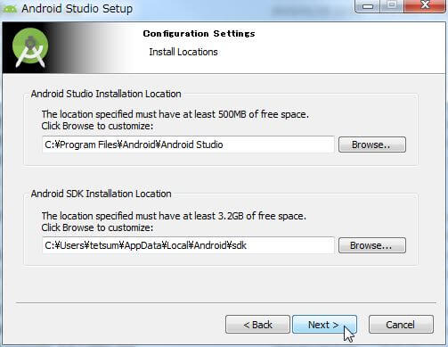 [Configuration Settings](Install Locations)画面が表示されるのでAndroid Studio、Android SDKのインストールフォルダを変更したければ[Brows..]ボタンから各変更先のパスを指定する。