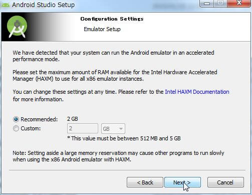 ※Android Studioで使用される端末エミュレータのメモリを何GBにするかの設定(インストール後でも変更可)