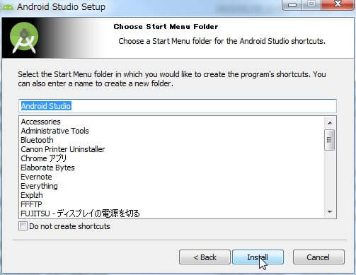 デスクトップにAndroid Studioのショートカットを作りたくなければ[Do not create Shortcuts]をオンにしてから[Next>]をクリックする。