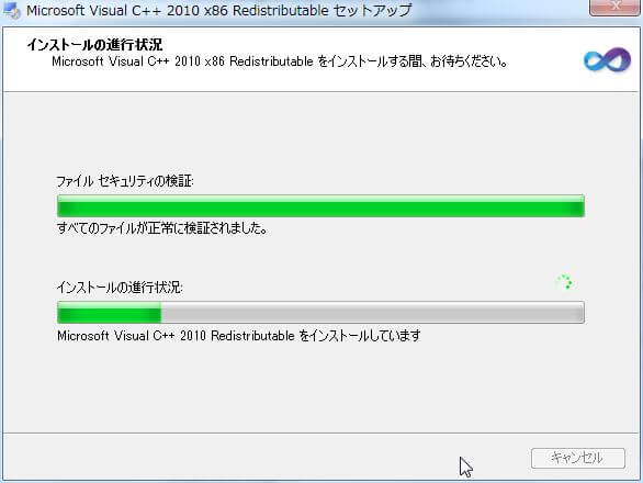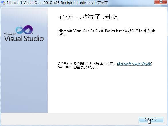 Microsoft Visual C++ のRedistributable(再頒布可能パッケージ)のインストール完了を示す画面が表示されるまで待って、画面が表示されたら[完了]をクリックする。