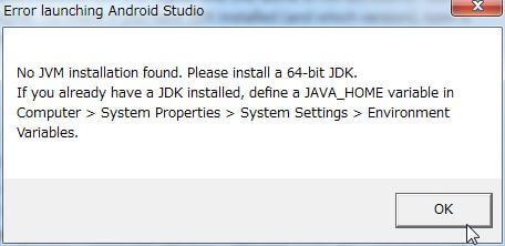 [Finish]ボタンを押した直後に以下のようなメッセージが表示されたらJDKのインストールと環境変数の設定がきちんと行われていないので、別記事「Android:Android Studioをインストールするための前提条件、JDK(Java Development Kit)のインストールと環境変数(JAVA_HOME)の追加方法」を参照してきちんと設定すること。