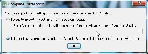 ※旧バージョンのAndroid Studioがインストールされていて旧バージョンの環境設定を引き継ぎたい場合(たぶん)は、[I want import my settings from a custom location]をオンにして[OK]をクリックする。