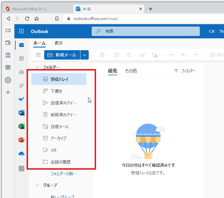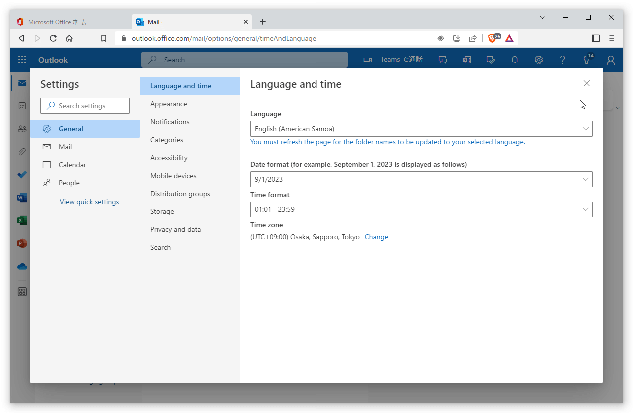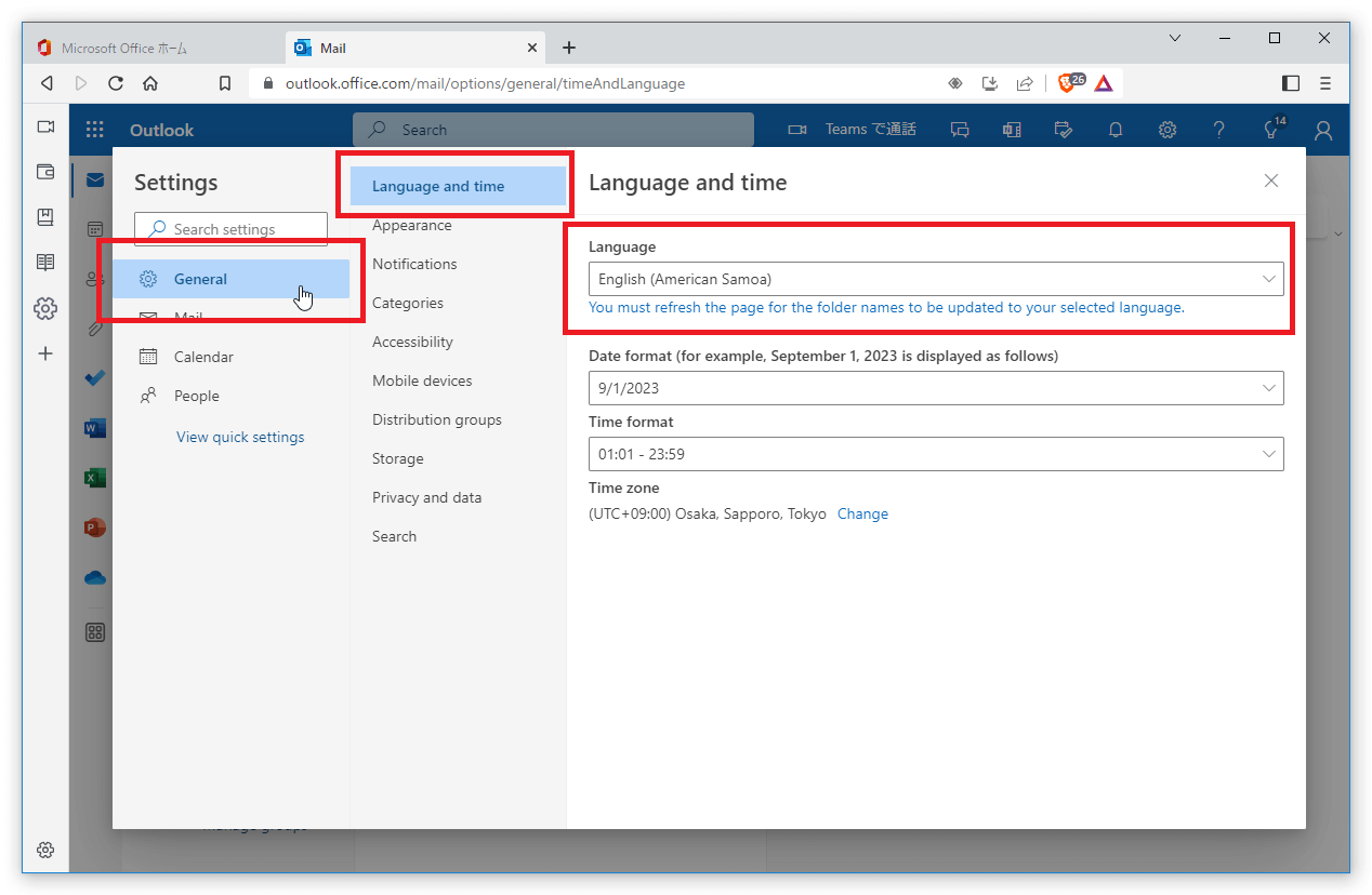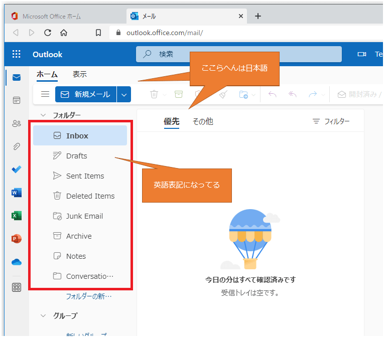 OutlookのWeb版を使用しているときに、メニューバー等の表示は日本語表記になっていても受信トレイなどのフォルダ名が英語表記になっている場合の対象方法について覚書。