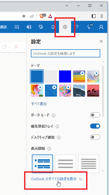 Outlookの右上の歯車アイコンをクリックし、[Outlookのすべての設定を表示]をクリックします。