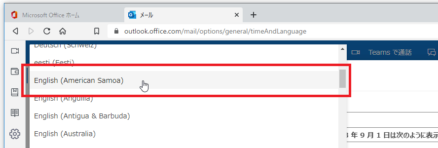 言語のリストから日本語以外の適当な言語を選択します。(画面では[English (American Samoa)]を選択しています。)
