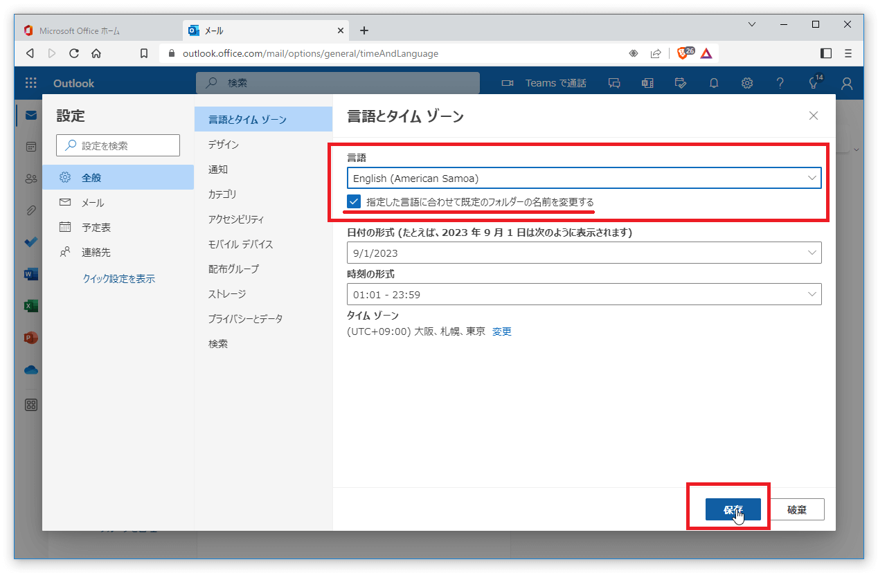 [言語とタイム ゾーン]の言語が選択した言語になっていること、[指定した言語に合わせて規定のフォルダーの名前を変更する]チェックボックスがオンになっていることを確認して[保存]をクリックします。