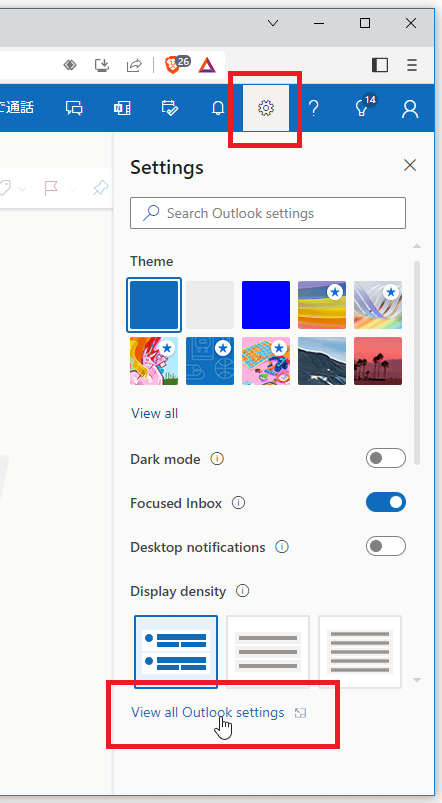 再度Outlookの右上の歯車アイコンをクリックし、[View all Outlook settings]をクリックします。