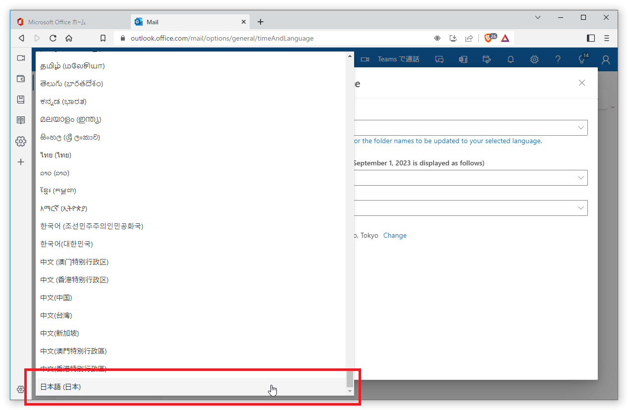 [Language]のドロップダウンリストをクリックし、[日本語 (日本)]を選択します。