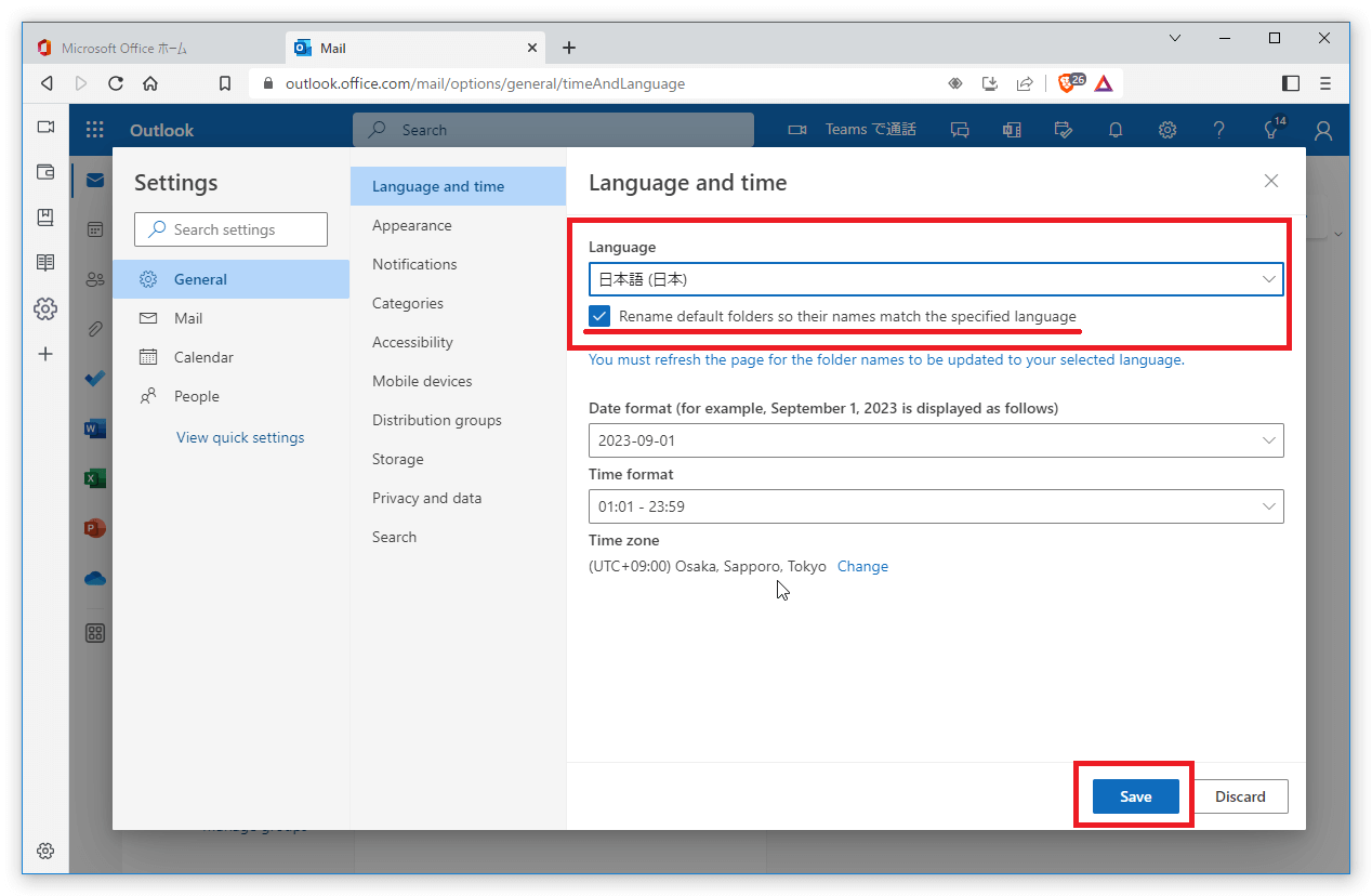 [Language]が「日本語 (日本)」になっていること、[You must refresh the page for the folder names to be updated to your selected language.]チェックボックスがオンになっていることを確認して[Save]をクリックします。