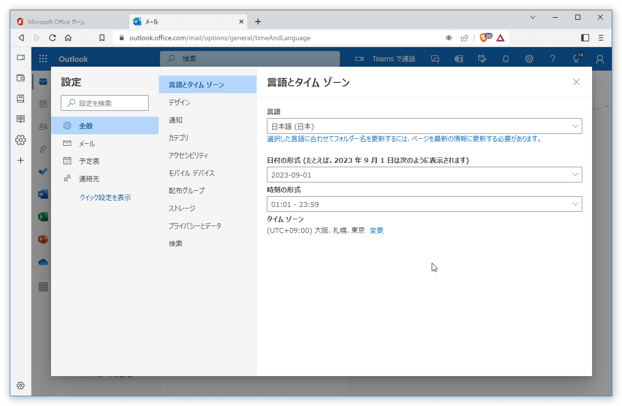 [設定]画面が表示されるので、左のメニューから[全般]をクリック、[言語とタイム ゾーン]をクリックします。