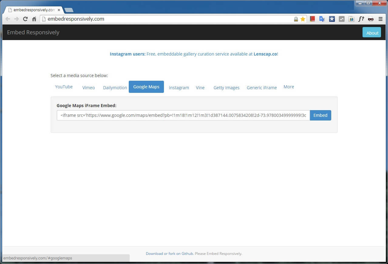 embedresponsively.com は、Youtube動画やGoogle Mapなどの埋め込みURLをサイトのテキストボックスに貼り付けてボタンをクリックすれば、貼り付けた埋め込みオブジェクトをレスポンシブ対応化させたコードを出力してくれます。