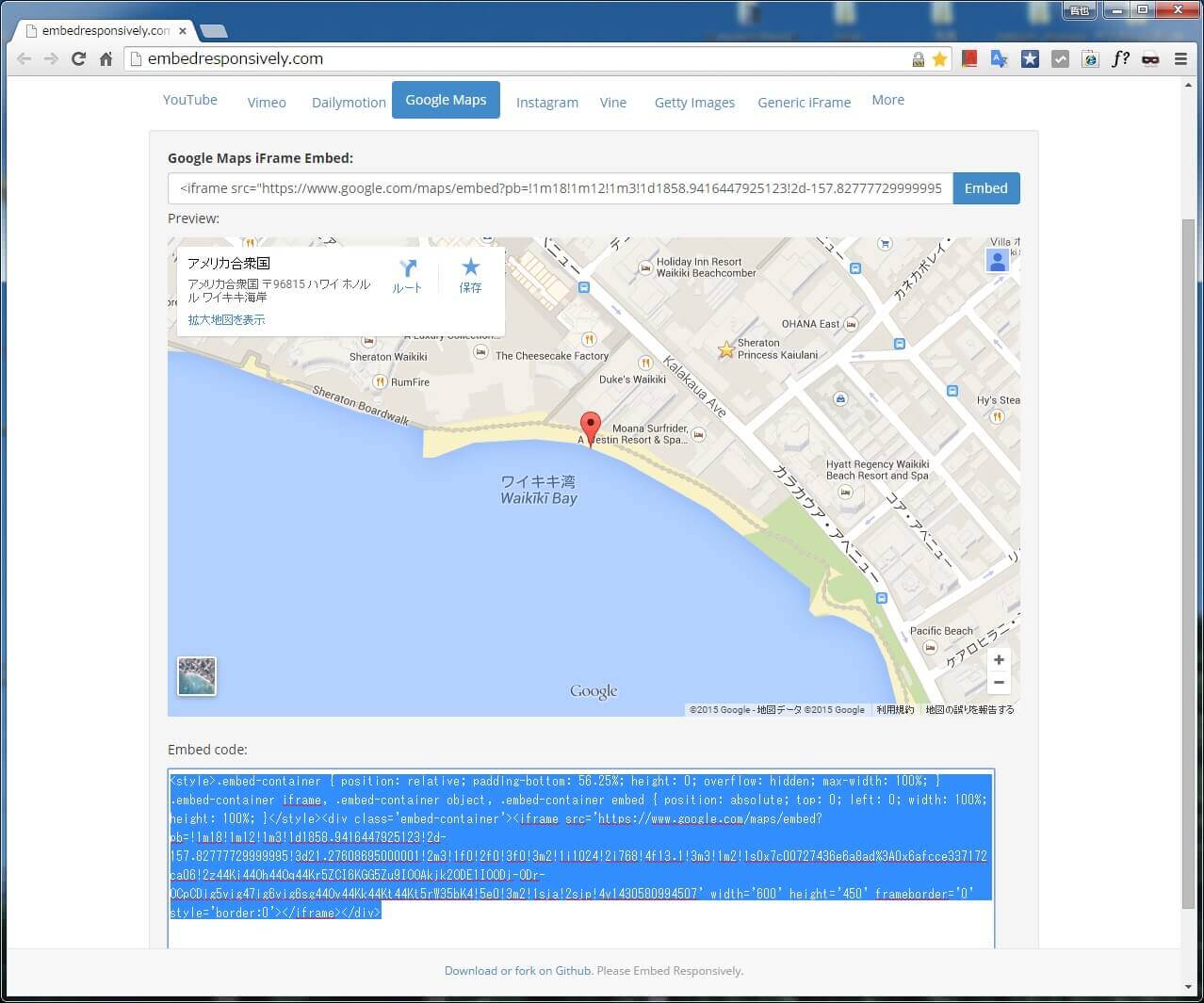 あとは出力されたコードを記事に貼り付ければスタイルシートなどの設定もする必要なく、埋め込んだオブジェクトがレスポンシブ対応化されて表示されるというとても便利なWebサイトです。