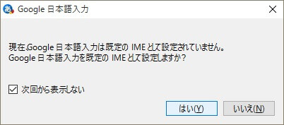 また、 「現在Google日本語入力は既定のIMEとして設定されていません。 Google日本語入力を既定のIMEとして設定しますか?」 というメッセージが表示され、[次回から表示しない]をオンにした上で[はい]をクリックしているにもかかわらず、ふとするとMicrosoft IMEに戻り、また同様のメッセージが表示されます。