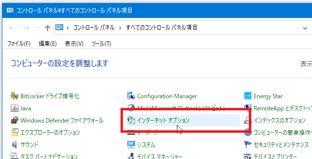 コントロールパネルを開いて[インターネット オプション]をクリックします。