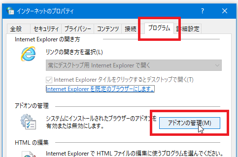 [インターネットのプロパティ] 画面の[プログラム]タブをクリックし、[アドオンの管理]をクリックします。