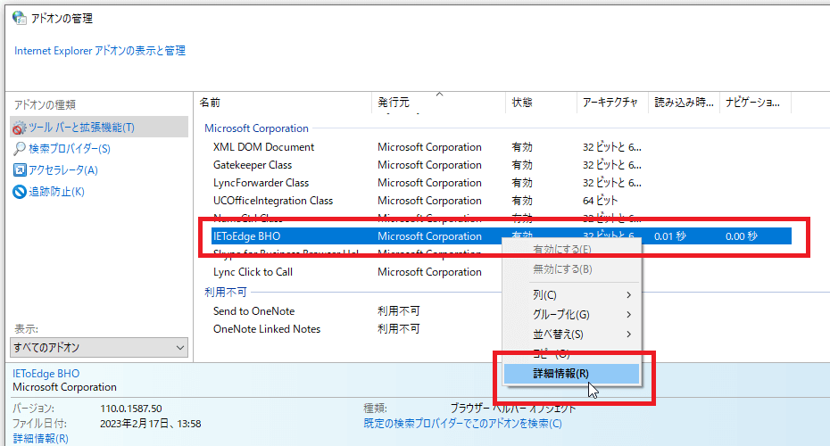 [アドオンの管理]画面のアドオンの一覧から「IEToEdge BHO」を右クリックして[詳細情報]をクリックします。