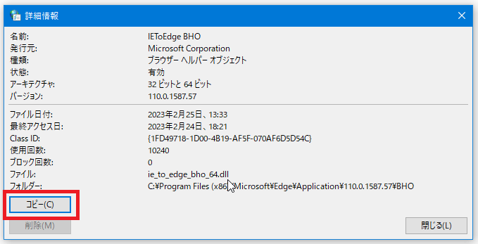 「IEToEdge BHO」の詳細情報画面が表示されるので[コピー]をクリックします。