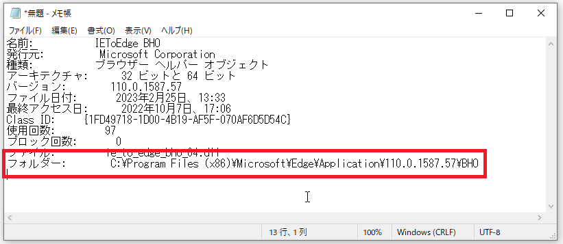 Windowsのメモ帳を起動して[Ctrl] + [v] で貼り付けると[詳細情報]に表示されていた内容が貼り付けられますので、[フォルダー:]に記載されたパスをエクスプローラーで開きます。