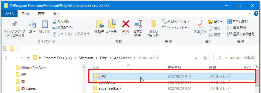 エクスプローラーで開いたフォルダのひとつ上のフォルダを参照して[BHO]というフォルダが表示されていることを確認します。