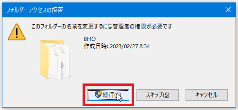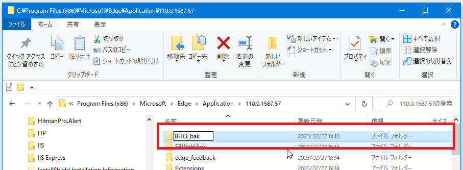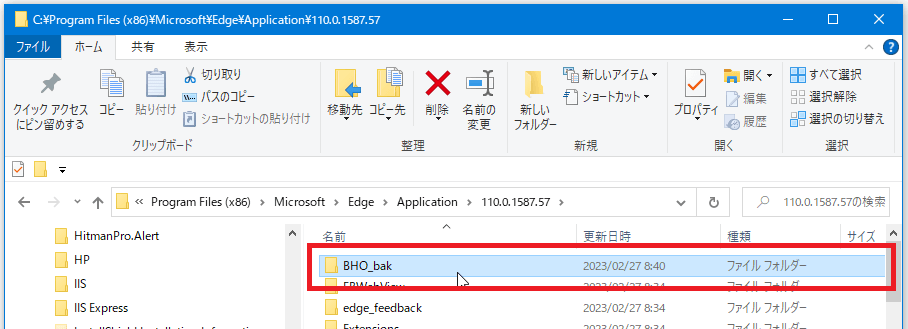 この[BHO]フォルダの名前を変更します。(名前は任意の名前、例えば「BHO_bak」とかでよいです)