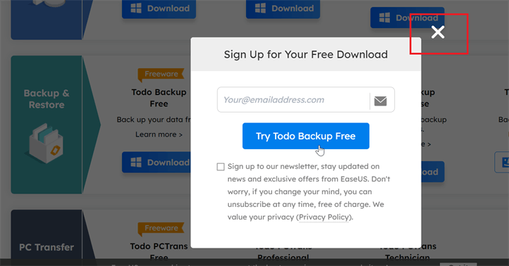 ダウンロードする際にメールアドレスの登録を求められますが、登録したくない場合は、一度[X]ボタンでメールアドレス登録画面を閉じて、再度[Download]ボタンをクリックすればメールアドレス登録なしにダウンロードができます。