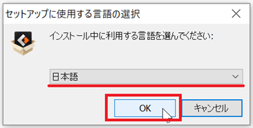 ダウンロードが完了するとインストールが開始され、以下の言語選択の画面が表示されるので[日本語]が選択されていることを確認し、[OK]をクリックします。
