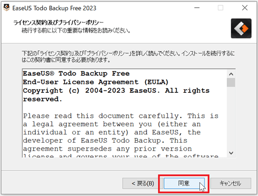ダウンロードされたファイルを実行すると「EaseUS Todo Backup インストーラー」が起動します。