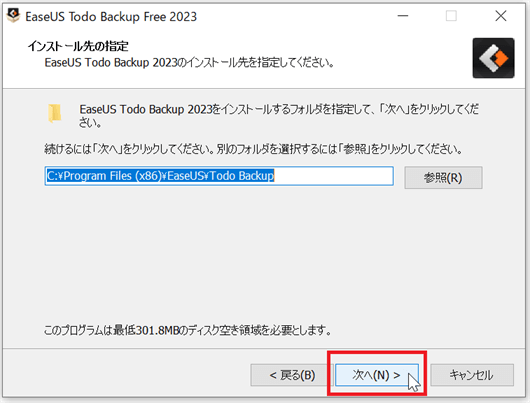 [インストール先の指定]画面が表示されるので、インストール先を変更した場合は[参照]ボタンをクリックしてインストール先を指定します。