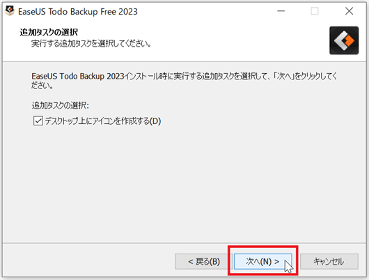 [追加タスクの選択]画面が表示されるので、[デスクトップ上にアイコンを作成する]オプションを任意でオン/オフにして[次へ]をクリックします。