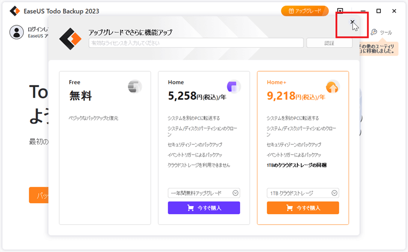 EaseUS Todo Backupの初回起動時にアップグレードに関する画面が表示されますが、無償版を使う場合は[X]をクリックして閉じてしまって構いません。