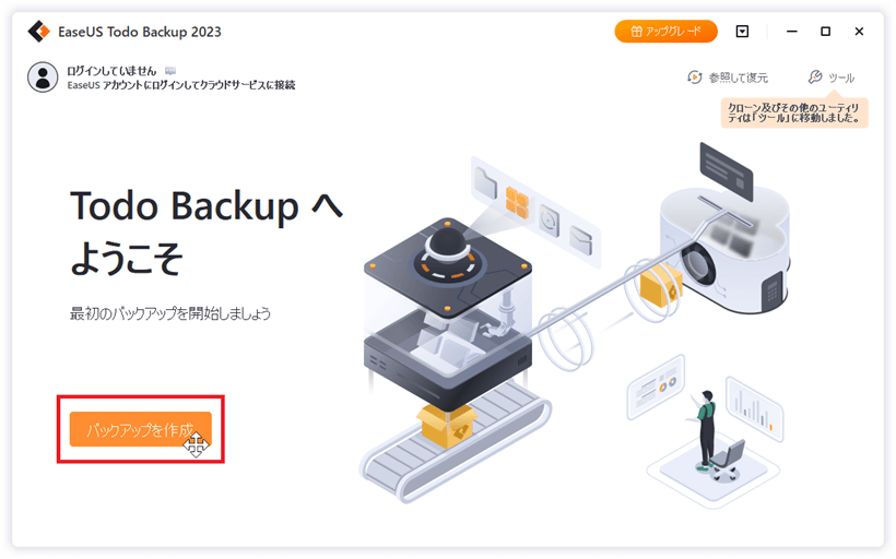 EaseUS Todo Backupの「ようこそ」画面の左下にある[バックアップを作成]をクリックします。
