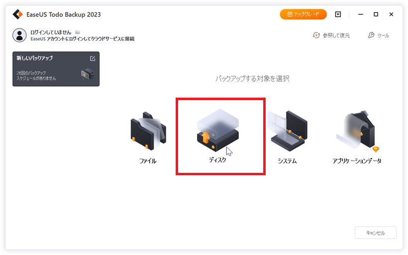 今回はバックアップ対象のデータも含めOSごとバックアップを取りたいので「ディスク」を選択してディスクのすべてのパーティションをバックアップします。