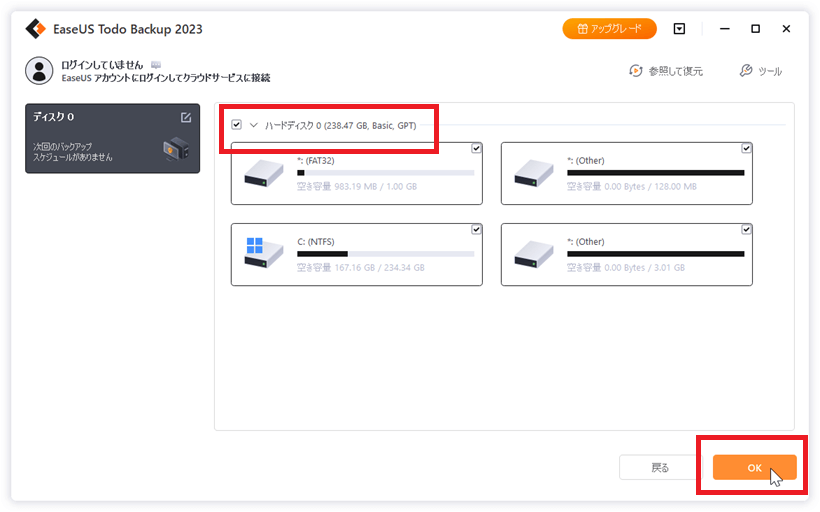 「ディスク」を選択すると以下のようにバックアップする対象ディスクを選択する画面が表示されますので、今回は[ハードディスク0]をオンにしてすべてのパーティションを選択して[OK]をクリックします。