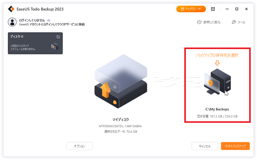 デフォルトだとバックアップ先は「C:\My Backups」フォルダになりますが、変更したい場合は[バックアップの保存先を選択]をクリックします。