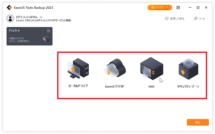 バックアップの保存先は、無償版の場合「ローカルドライブ」か「NAS」のいずれかを選択できます。