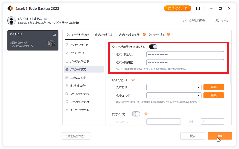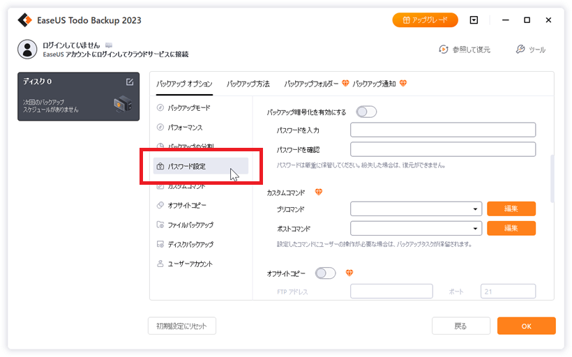 今回は、バックアップファイルを暗号化して保護するために[バックアップ オプション]の[パスワード設定]を選択します。