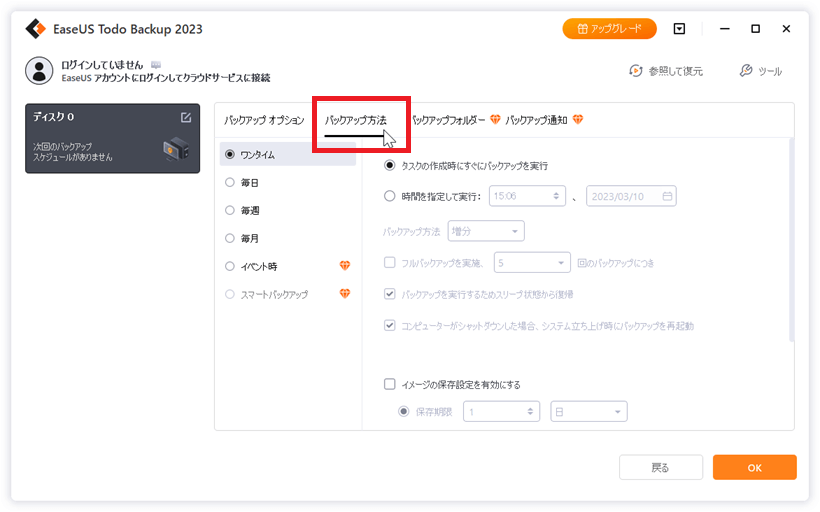 [バックアップ オプション]には、バックアップをスケジューリングするための[バックアップ方法]というオプションがあります。