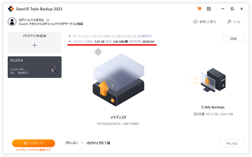バックアップが開始され、画面にバックアップ処理の経過と完了までのおおよその残り時間が表示されます。