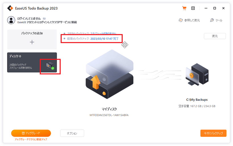 今回は試用なのでバックアップファイルをバックアップしたディスクに保管しましたが、本来はバックアップしたディスクとは異なるディスクやクラウドなど別の場所にバックアップしてください。