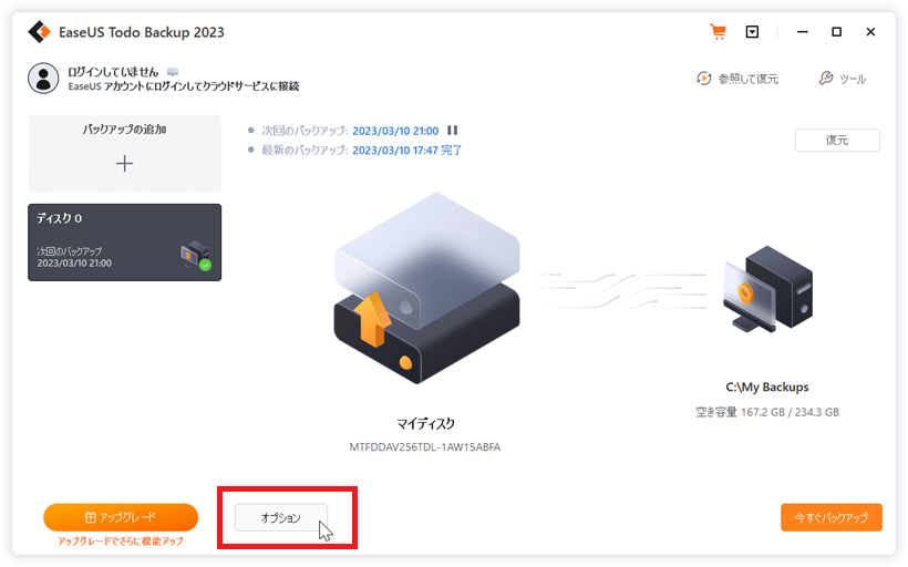 EaseUS todo backupの画面から[オプション]をクリックします。
