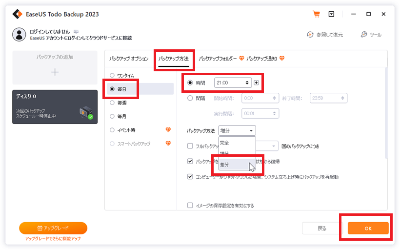 さらに[バックアップ方法]のドロップダウンリストから「差分」を選択し、[OK]をクリックします。