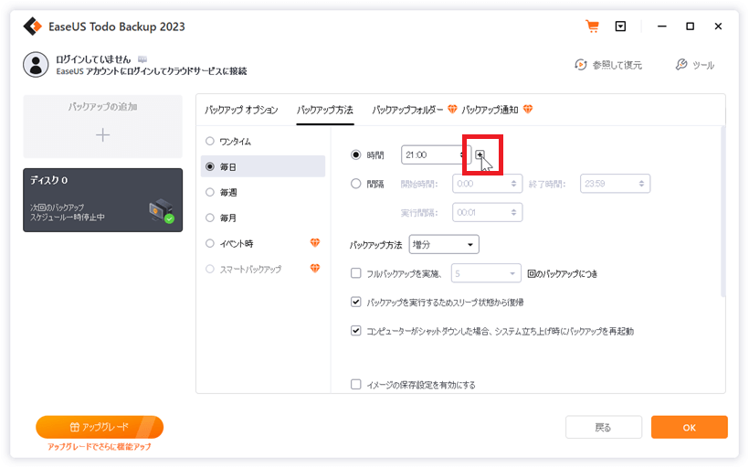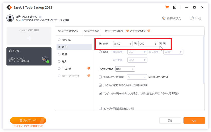 [バックアップ方法]タブをクリックし、[毎日]オプションをオン、[時間]オプションをオンにして[時間]に「21:00」を設定します。