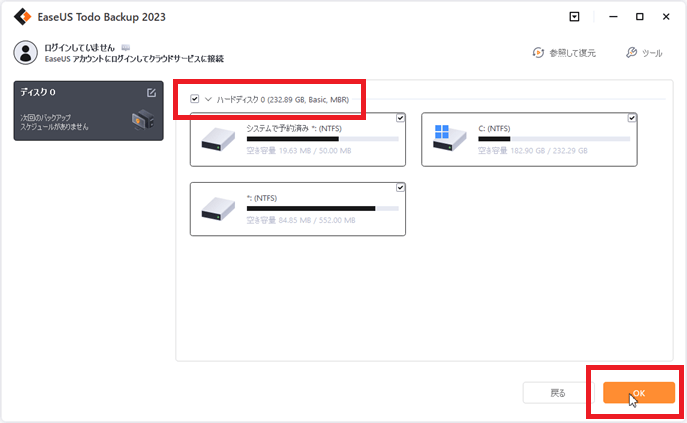 [ハードディスク 0]をクリックしてすべてのパーティションを選択、[OK]をクリックします。