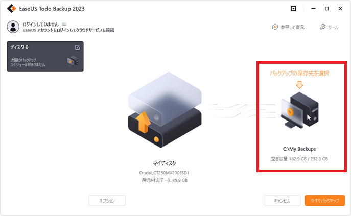 ※本来は内臓もしくは外付けの別ディスクやNASを選択してバックアップ元のディスクが故障してもバックアップが戻せるようにするべきですが、今回は試行なのでバックアップ元ディスクと同じディスクを選択しています。