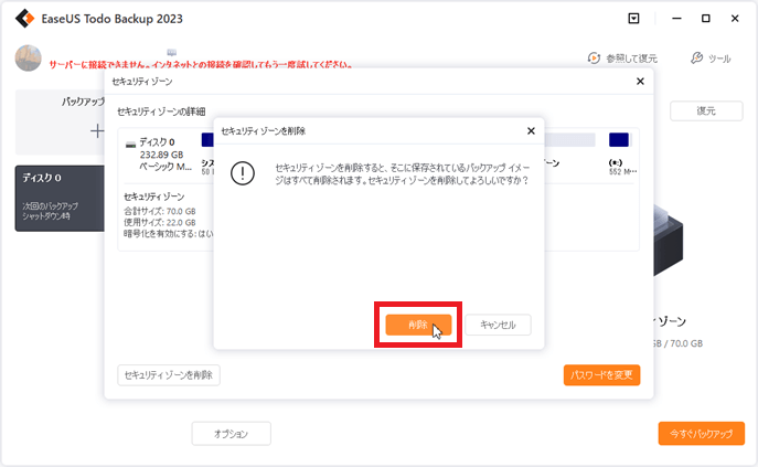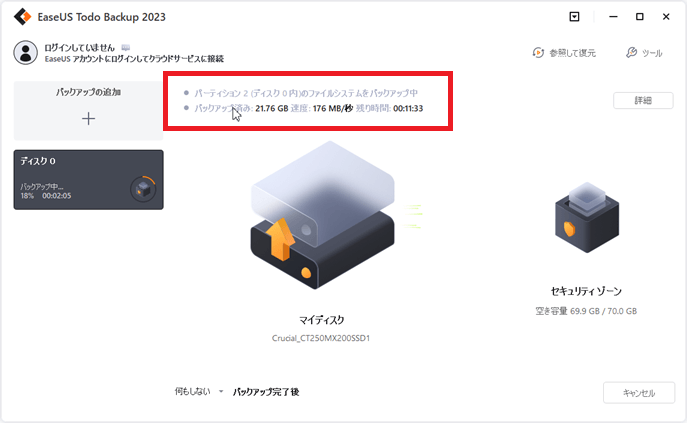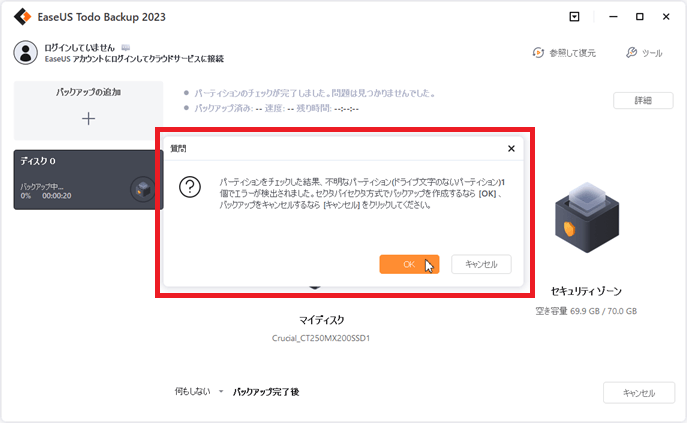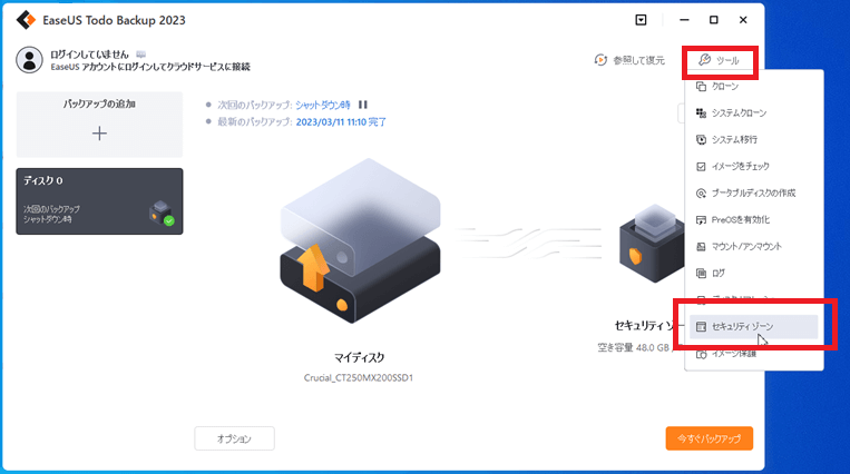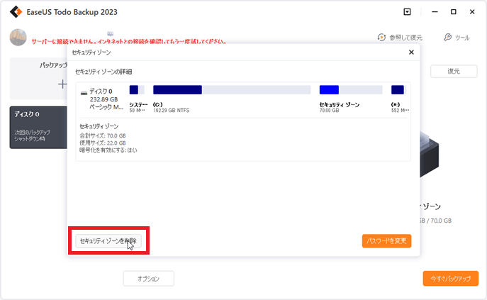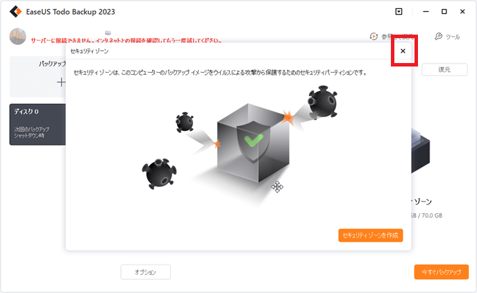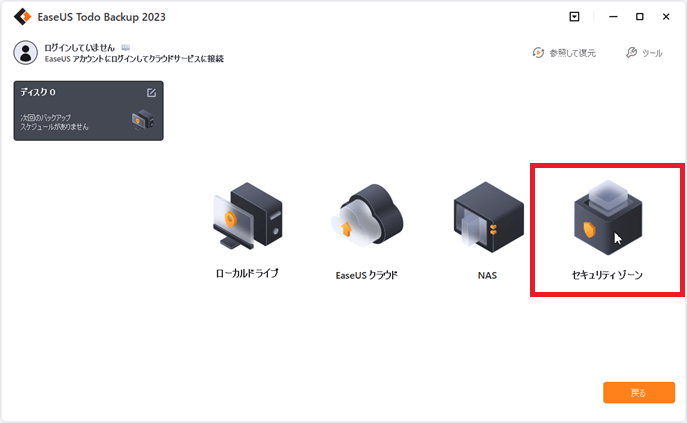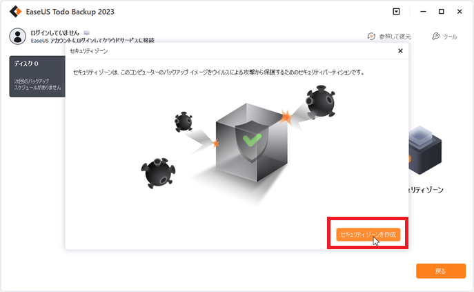 EaseUS todo backupのセキュリティゾーンとは、ハードディスクの一部を隠しパーティションとして確保し、そこにバックアップを保存する機能です。