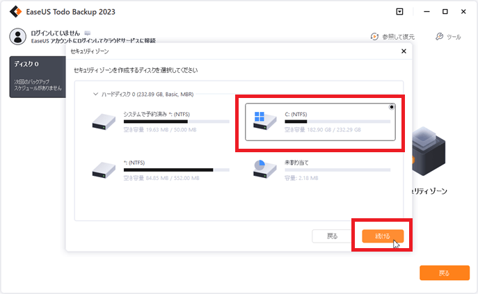 「セキュリティゾーンを作成するディスクを選択してください」画面でセキュリティゾーンを作成するディスクを選択して[続ける]をクリックします。