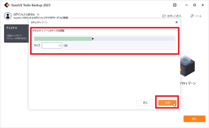 「セキュリティゾーンのサイズを調整」画面が表示されるので、バーをドラッグしてサイズを調整するか[サイズ]ボックスに直接セキュリティゾーンのサイズ(容量)を入力して[作成]をクリックします。(画面では70GBを指定)