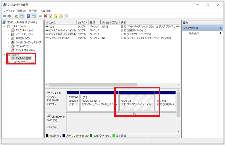 作成したセキュリティゾーンですが、Windowsの[コンピューターの管理]の[ディスクの管理]画面で確認するとドライブレターが設定されていない「プライマリ パーティション]として作成されていることがわかります。